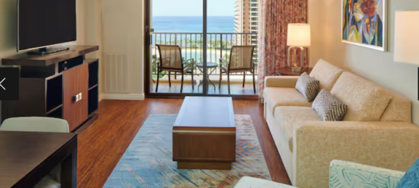 The Kalia Tower one-bedroom suite includes a king-sized bed or double beds and full-sized sofa bed, The fully equipped kitchen includes a full-sized refrigerator, microwave, dishwasher oven/stove – plus utensils. The living area features, chair and ottoman, 65-inch TV, DVD player and PlayStation 3.