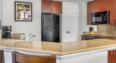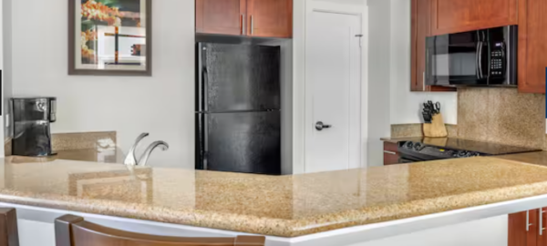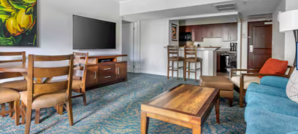 The Lagoon Tower one-bedroom suite includes a king-sized bed a full-sized sofa bed, The fully equipped kitchen includes a full-sized refrigerator, microwave, dishwasher oven/stove – plus utensils. The living area features, chair and ottoman, 65-inch TV, DVD player and PlayStation 3.