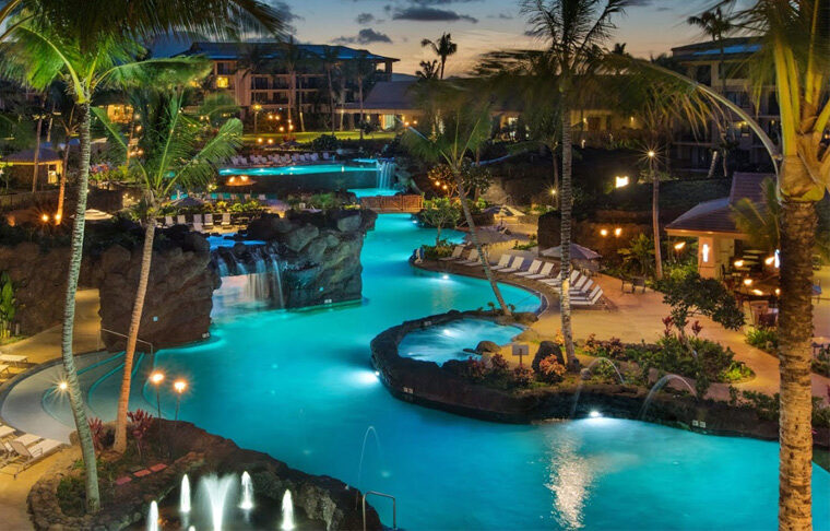 A luxury resort on the beach in Poipu Kauai Hawaii. The Koloa Landng Resort is a picture-perfect tropical escape surrounded world-famous beaches and next door to some of the best dining & shopping on the island. The resort itself boasts the largest accommodations in Poipu from deluxe studios to multi-bedroom luxury villas. The property features 3 resort pools including a 350,000-gallon main pool, a celebrity chef grill, gourmet market, full service day spa, 24-hour fitness center.