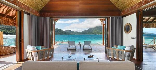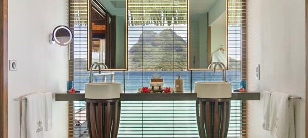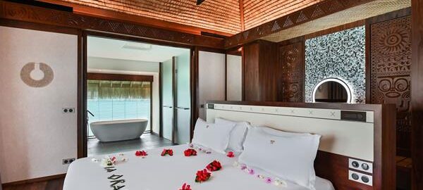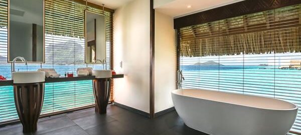 Recently remodeled,  Uuparalleled views of Bora Bora’s Mount Otemanu, and are another favorite at the resort. Spacious bedroom area with an en-suite bathroom. Glass top bedside and coffee tables, as well as glass top by the bathtub, provides soothing views of the water and sealife.